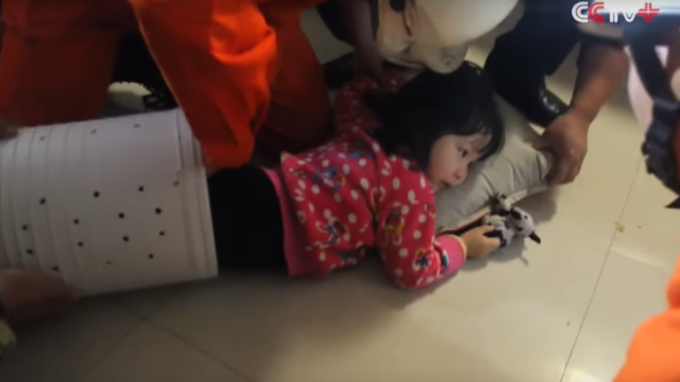 The toddler had been playing in her home in Northwest China this past weekend and when her parents weren’t looking, she climbed on top of the washing machine and decided to crawl inside the drum of the twin tub machine.