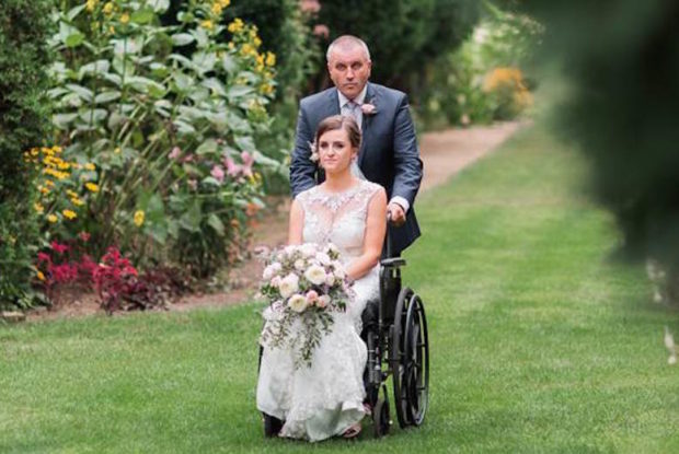 When it came time for Sarah to meet her groom at the wedding altar, her father pushed her wheelchair to meet Stuart, who picked her up and carried her down the aisle.